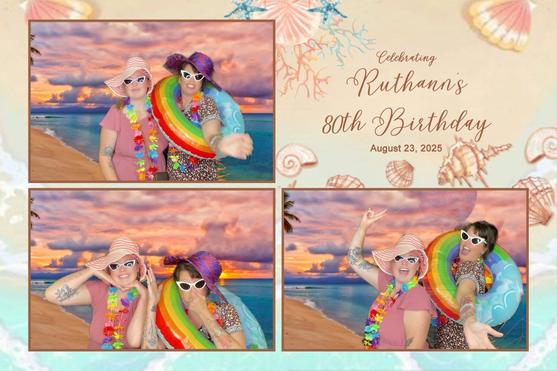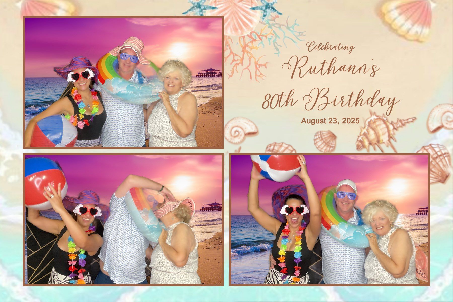 Since the party theme was the beach, we designed a custom sunset backdrop that transported guests straight to the shoreline. To match the theme, our booth included colorful props like leis, oversized sunglasses, floppy beach hats, inflatable beach balls, and rainbow floats. Guests loved the chance to strike fun poses and fully embrace the tropical vibe.
